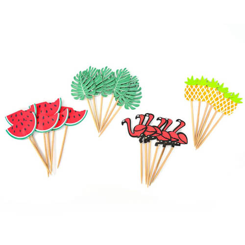 קיסמים לקישוט בקונספט קיץ, עם אננס, פלמינגו, אבטיח ועלים טרופיים