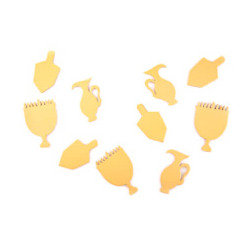 קישוטי שולחן בצורת סמלי חנוכה, בצבע זהב הקישוטים כוללים חנוכיות, סביבונים וכדי שמן . 12 קישוטים במארז