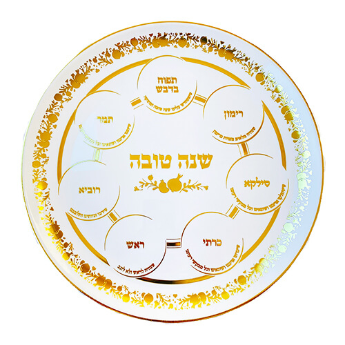 מגש ברכות לראש השנה בצבע לבן וברכות מאוירות בצבע זהב, מושלם לשולחן ראש השנה.