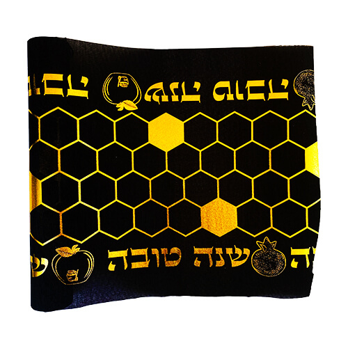 ראנר שחור לעיצוב שולחן ראש השנה עם הדפס כוורת, תפוחים וברכת: שנה טובה גודל הראנר: 3 מטר על 36 ס”מ