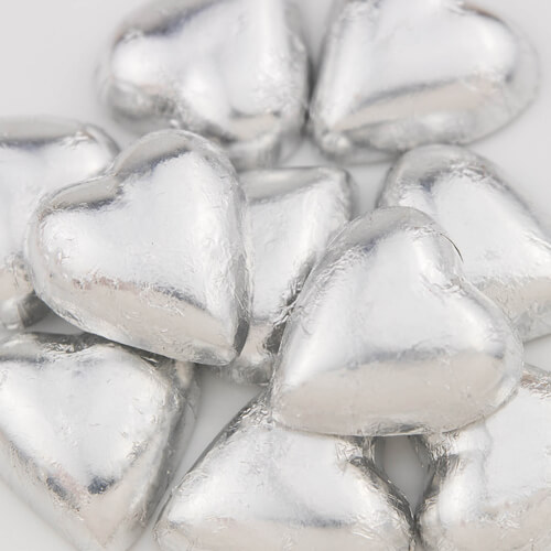 לבבות שוקולד איכותיים ויוקרתיים מצופים בעטיפה מטאלית בצבע כסף