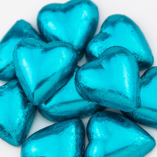 לבבות שוקולד איכותיים ויוקרתיים מצופים בעטיפה מטאלית בצבע תכלת