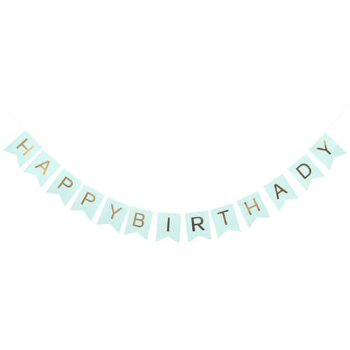 שרשרת אותיות בצבע זהב על רקע טורקיז בכיתוב יום הולדת שמח באנגלית