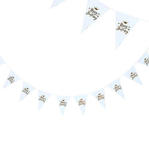 שרשרת דגלונים לתלייה, לבן עם כיתוב Happy Birthday זהב