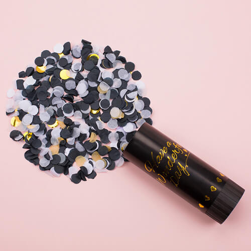 תותח קונפטי קטן בצבעים: שחור, לבן וזהב מטאלי