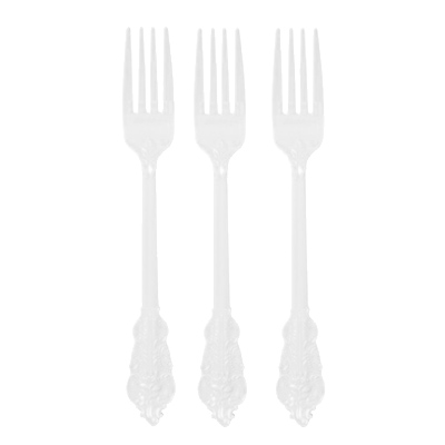 מזלגות חד פעמיות לבנות, עשויות מפלסטיק קשיח ואיכותי במיוחד בדוגמת וינטג’.
