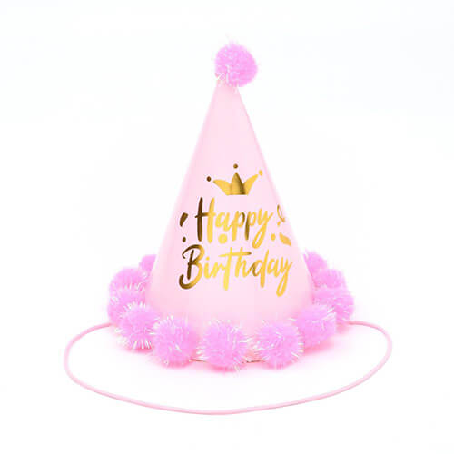 כובע מסיבה בצבע ורוד עם הכיתוב “Happy Birthday To You” בהטבעת זהב. בקצה ובבסיס הכובע פונפונים בצבעים ורוד וזהב. מושלם לכל יום הולדת.